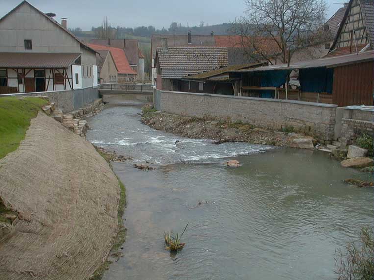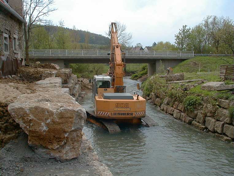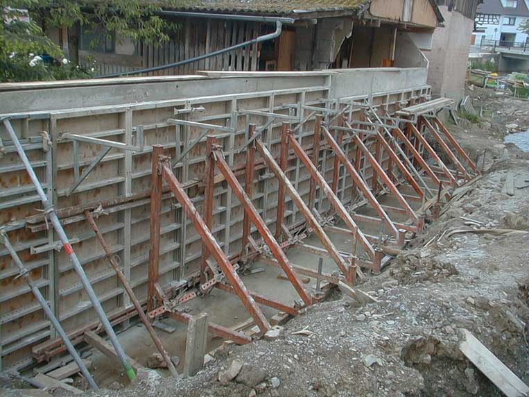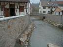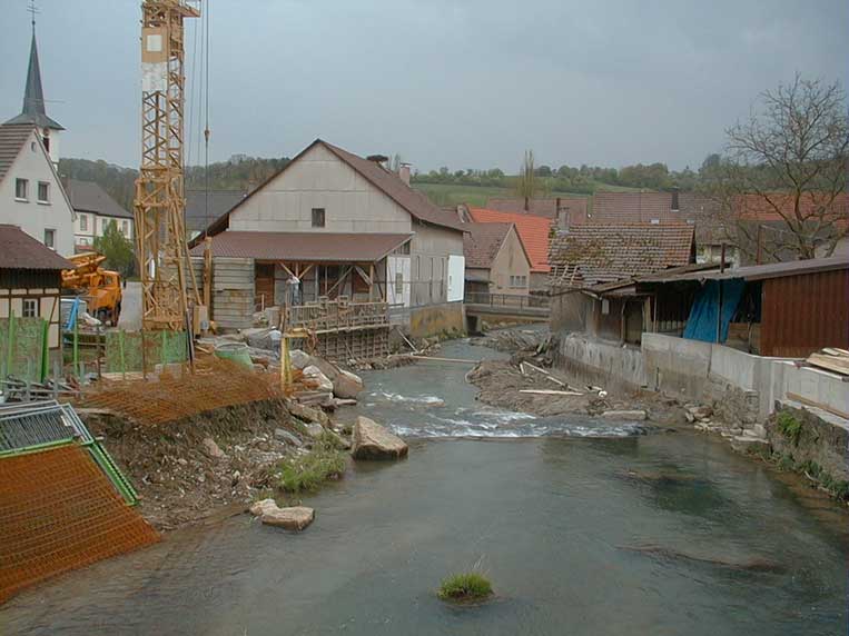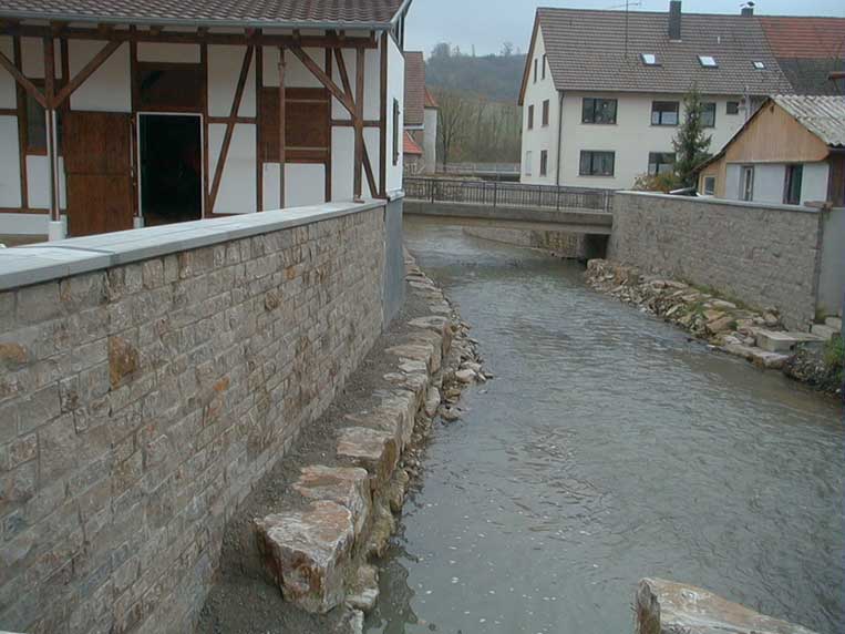 HWS entlang des Erlenbachs aus Stahlbetonstützwänden mit Natursteinverkleidung