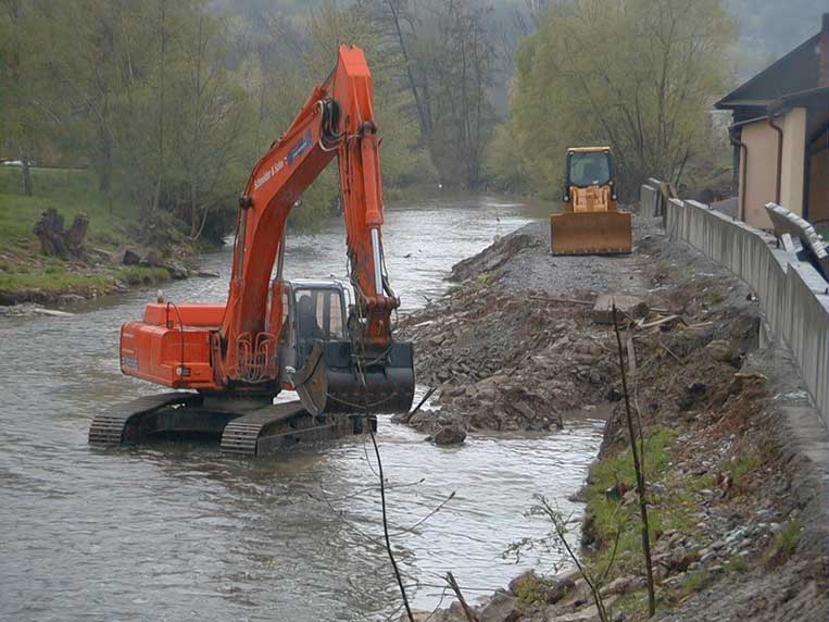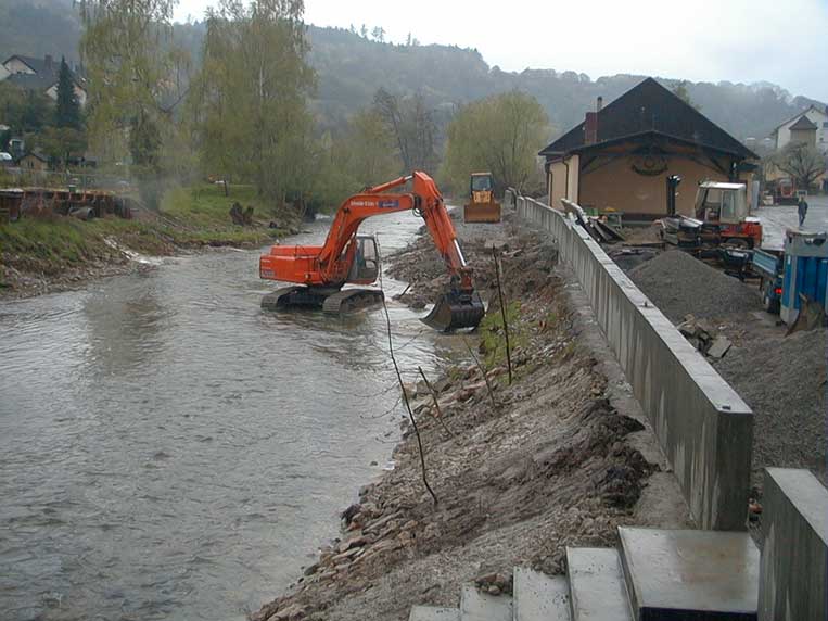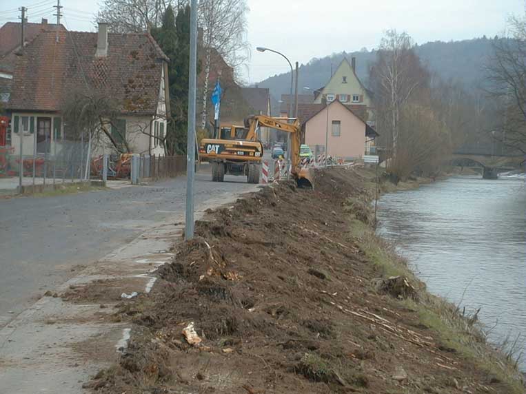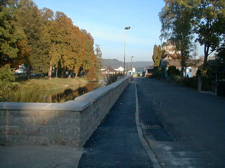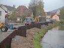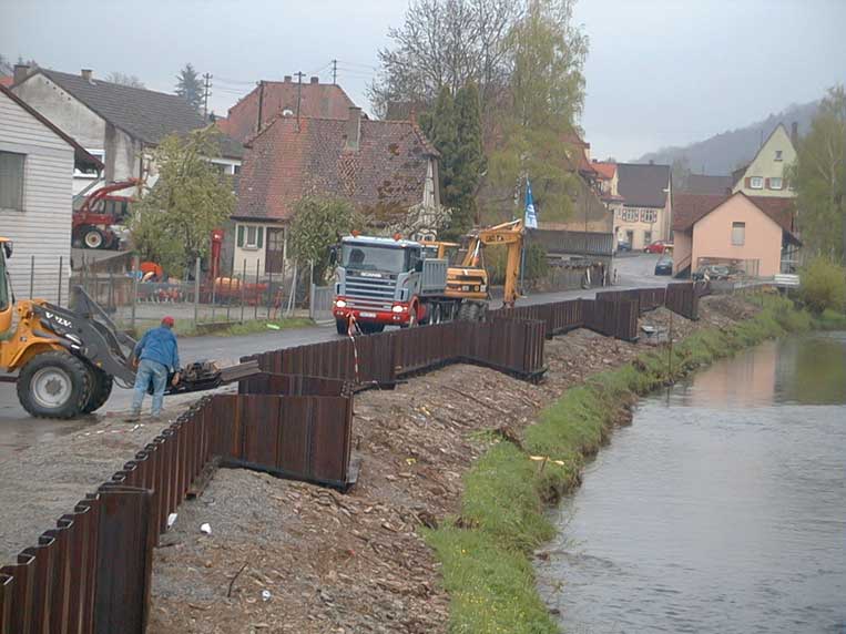 Hochwasserschutzwand mittels Spundwand und Muschelkalkverblendung,